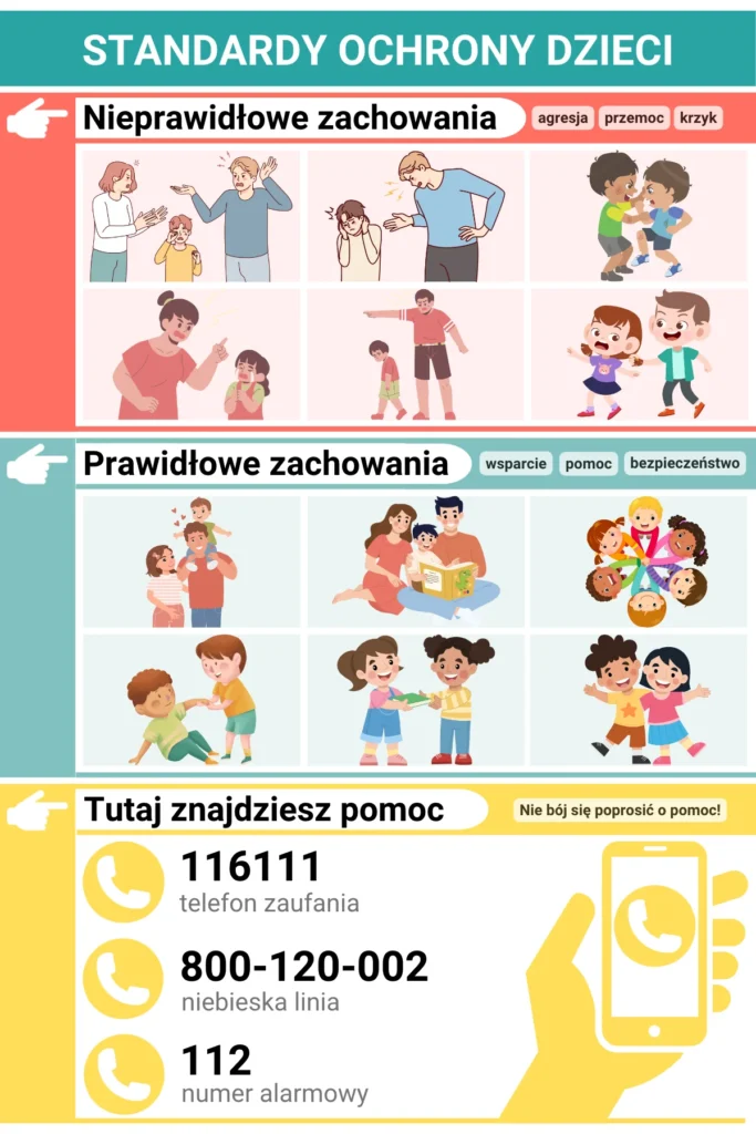 6. Kontakt fizyczny z dzieckiem nigdy nie może być niejawny bądź ukrywany, wiązać się z jakąkolwiek gratyfikacją ani wynikać z relacji władzy. Jeśli będę świadkiem jakiegokolwiek z wyżej opisanych zachowań i/lub sytuacji ze strony innych dorosłych lub dzieci, zawsze będę reagować zgodnie z procedurami interwencji.